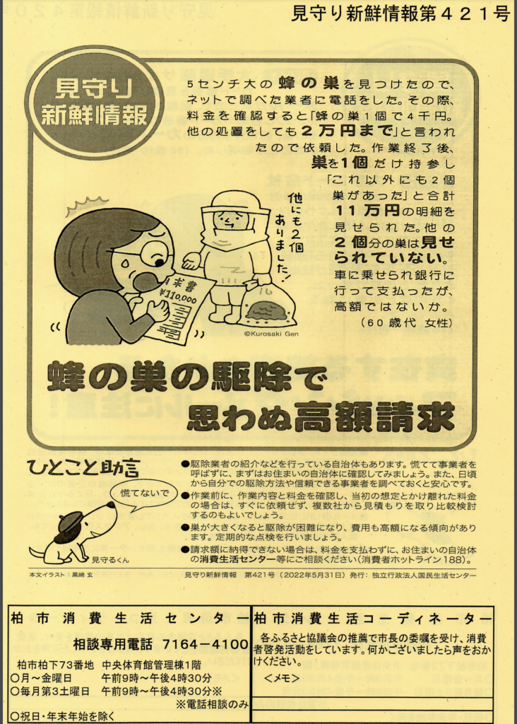 柏市でもこのような蜂の巣駆除の業者とのトラブルが日常茶飯事に起きているようです。