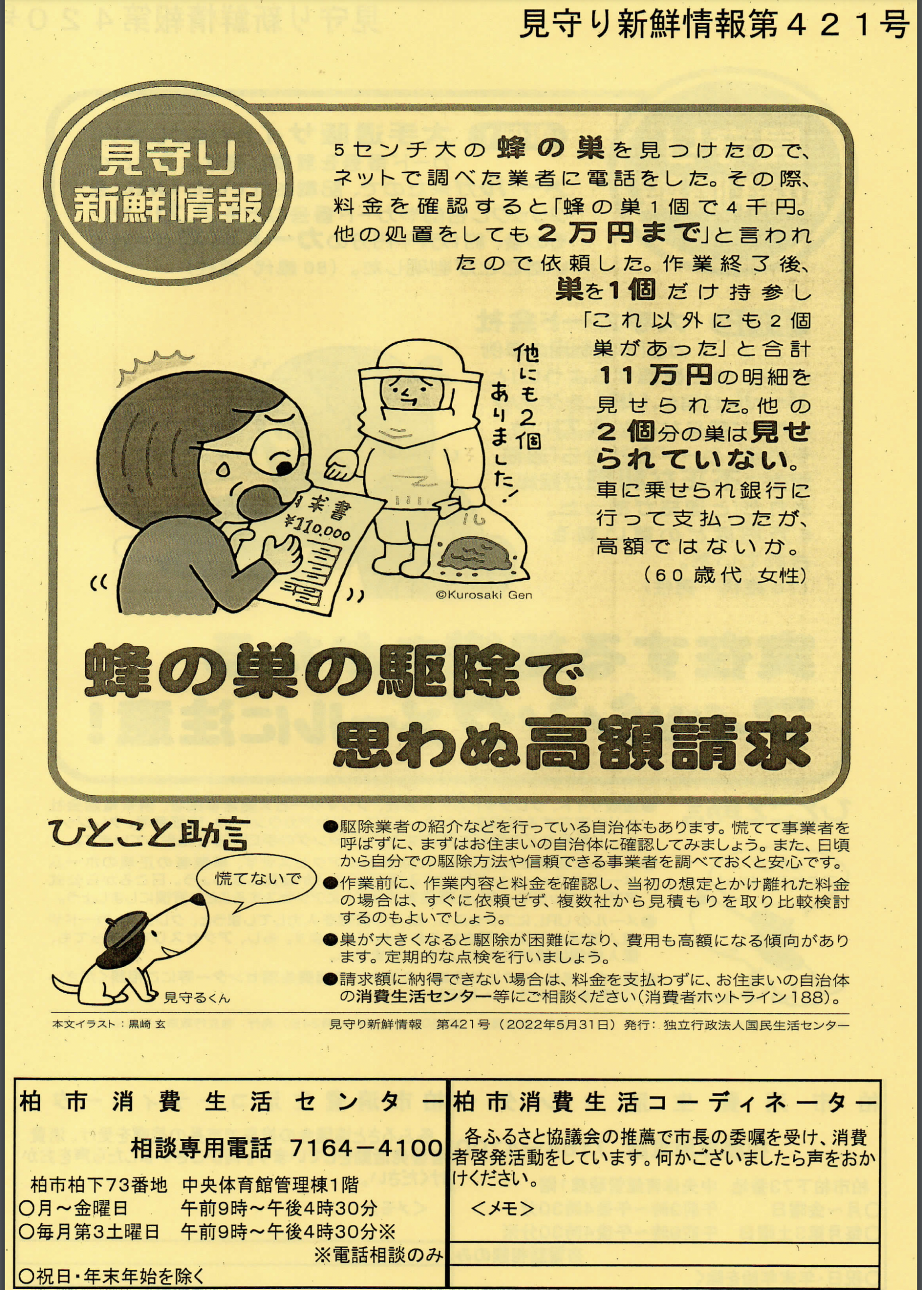5cm大の蜂の巣を見つけたので、ネットで調べた業者に電話した。その際、料金を確認すると「蜂の巣1個で4千円。他の処置をしても2万円まで」と言われたので依頼した。作業終了後、巣を1個だけ持参し「これ以外にも2個巣があった」と合計11万円の明細を見せられた。他の2個分の巣は見せられていない。車に乗せられ銀行に行って支払ったが、高額請求ではないか。