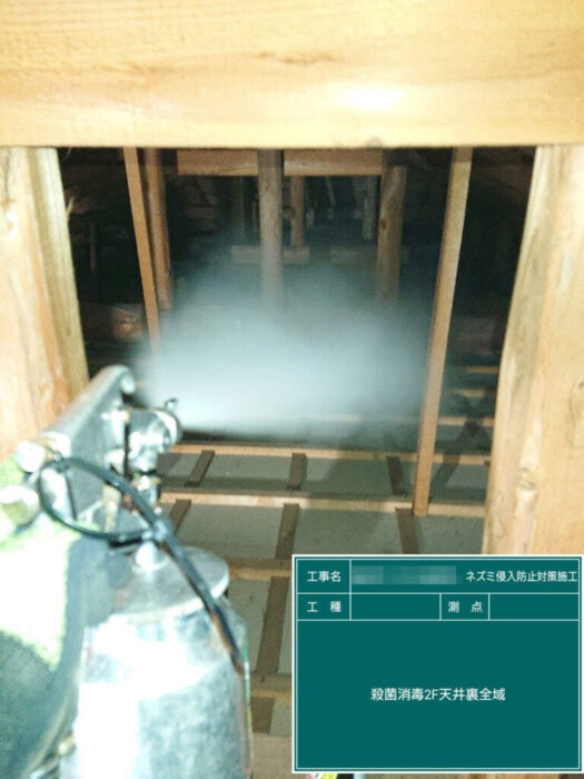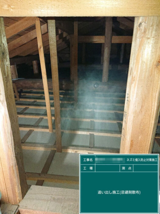 しばらく様子を見た後、念の為ネズミが嫌がる忌避剤を散布して確実に追い出しをかけていきます。