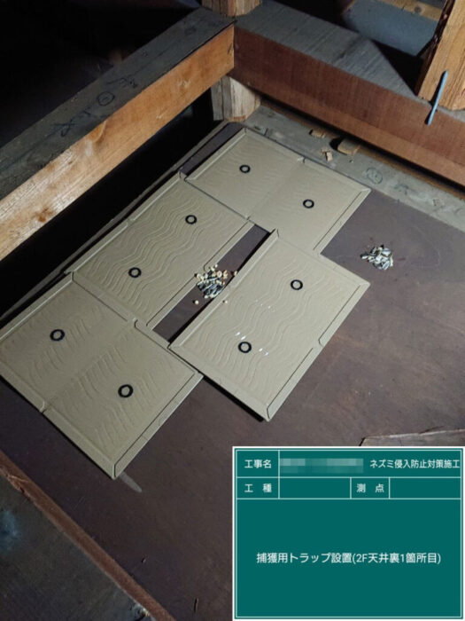 天井裏に残っているかもしれないネズミを捕獲するため、粘着シートとエサを置いて仕掛けていきます。
