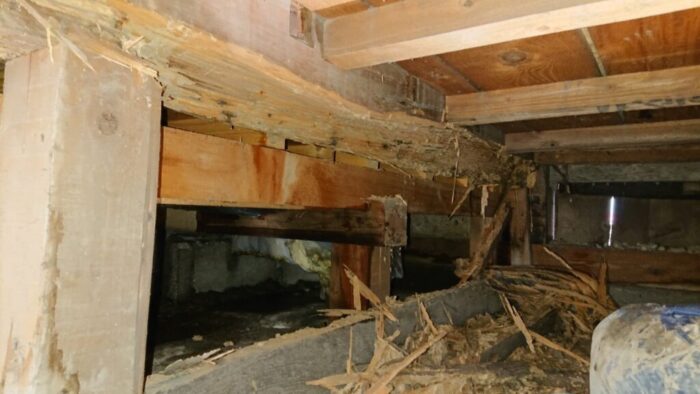 ある箇所では、ご覧のように根太を受ける大引きという木材もシロアリに食われて朽ちている状態です。