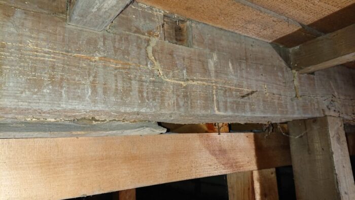 地震で家が倒壊する原因の1つにシロアリによる被害での家の強度の低下があります。