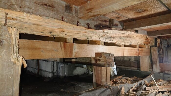 損傷が激しい箇所は、家の土台の強度が極端に落ちてしまうため、お客様とお打ち合わせの上、大工さんによる修復と補強を行いました。